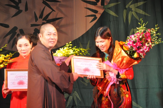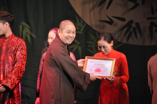 Nghệ sĩ ưu tú Thúy Đạt tặng hoa cho cư sĩ Xuân Loan - Ủy viên HĐTS GHPGVN