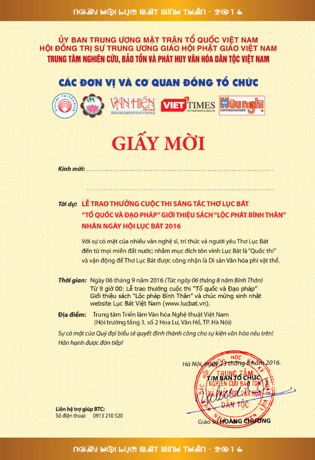 - Giấy mời: BTC chỉ phát hành Giấy mời (mẫu đính kèm) cho các Đại biểu quan khách (có danh sách cụ thể); Các Phóng viên thông tấn báo chí (có danh sách mời cụ thể); Các thành viên Ban biên tập và Tác giả là cộng tác viên tích cực của Website Lục Bát Việt Nam (có danh sách cụ thể); Thành viên các CLB Lục Bát (liên hệ BTC đăng ký tham dự).