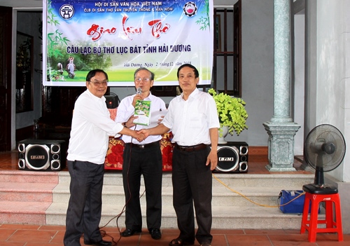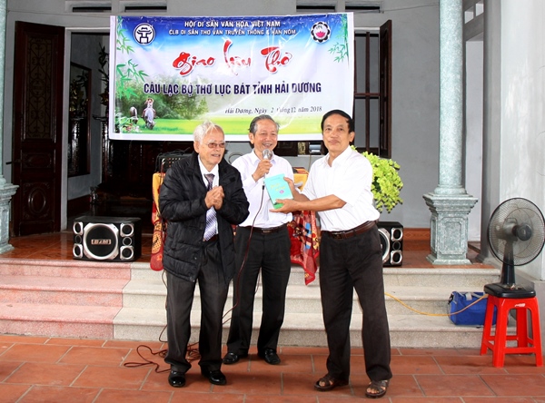 Tác giả: Nguyễn Đức Nhân (trái) tặng sách thơ cho Ban CN CLB Lục bát tỉnh Hải Dương