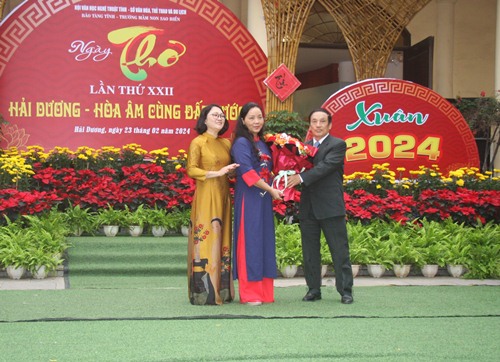 CN CLB thơ Lục Bát tỉnh HD tặng hoa chúc mừng CT Hội VHNT tỉnh HD Trương Thi Thương Huyền nhận hoa